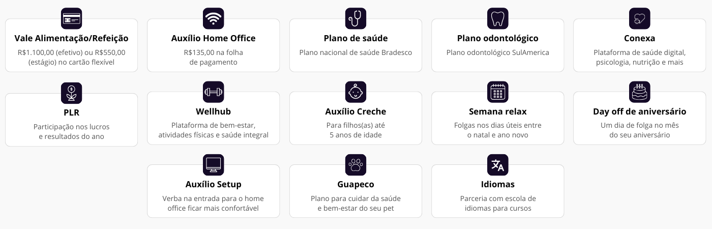 - Vale Alimentação/Refeição: R$ 1.100,00 mensais no cartão flexível, sem desconto em folha.